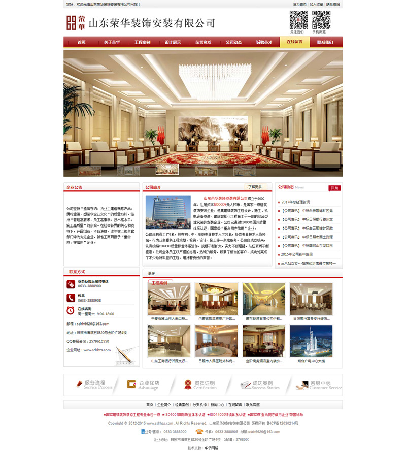 公司自成立以來,認真按照ISO9001質(zhì)量標準體系運作,規(guī)模不斷擴大,實力不斷增強,隊伍素質(zhì)不斷提高。公司全體員工以嚴謹?shù)膽B(tài)度、熱誠的服務(wù),積累了相當?shù)目蛻,成功的完成了很多艱巨的建筑安裝工程,維持著良好的聲譽。公司尊重知識,尊重人才,開發(fā)技術(shù)力量,依靠科技進步,創(chuàng)造自己的企業(yè)文化,激發(fā)員工的向心力和凝聚力。建立起了完善的集設(shè)計、施工、銷售、服務(wù)等為一體的時常經(jīng)營體系。同時,不斷加強企業(yè)內(nèi)部管理,實現(xiàn)了公司電腦網(wǎng)絡(luò)化管理。塑造品牌,重視信譽,嚴把質(zhì)量關(guān),形成了一整套完善的施工管理和質(zhì)量保證體系,使榮華形成了一支凝聚力強,能夠立足山東,面向全國,高瞻遠矚,積極向上的集體。“做精品工程,創(chuàng)榮華品牌”的經(jīng)營理念使榮華的事業(yè)蒸蒸日上.我公司先后在省內(nèi)外承接了金階商務(wù)酒店室內(nèi)裝修工程、山東淄博市工商銀行沂源、南定、洪溝、臨淄、桓臺、胡田、王舍、唐索路等分理處室內(nèi)外裝飾工程、寧夏石嘴山市大武口新區(qū)行政及文化中心裝飾工程、蒙東能源有限公司伊敏河東礦區(qū)第一煤礦辦公樓及宿舍樓裝飾工程、內(nèi)蒙古鄂溫克發(fā)電廠行政辦公區(qū)及輔助生活區(qū)裝飾工程、日照市人民醫(yī)院外科病房樓及生活服務(wù)中心室內(nèi)裝飾工程、山東省日照銀行莒縣支行辦公樓裝飾工程、安徽省合肥市安徽移動大廈辦公樓室內(nèi)裝飾工程、山東日照市工商銀行市中分理處、山東省博物館新館(通風空調(diào)安裝工程)、河南省人民醫(yī)院(通風空調(diào)安裝工程)、山東大廈賓館樓(空調(diào)系統(tǒng)及主供電系統(tǒng)安裝工程)、西安海關(guān)緝私辦公大樓(裝飾、空調(diào)工程)、西安中建西北設(shè)計院(安裝及部分裝飾工程)、日照市人民醫(yī)院特需病房樓(智能化安裝工程)、日照市會展中心(音響視頻會議系統(tǒng)設(shè)計及安裝調(diào)試工程)、日照永發(fā)房地產(chǎn)風景水岸花園G5#G6#(外墻保溫屋面保溫工程)等大、中型室內(nèi)外裝飾安裝工程共40余項,完成的工程涵蓋黨政、金融、企業(yè)、酒店、醫(yī)院、房地產(chǎn)類等眾多領(lǐng)域。工程一次驗收合格率達100%,優(yōu)良率達96%。